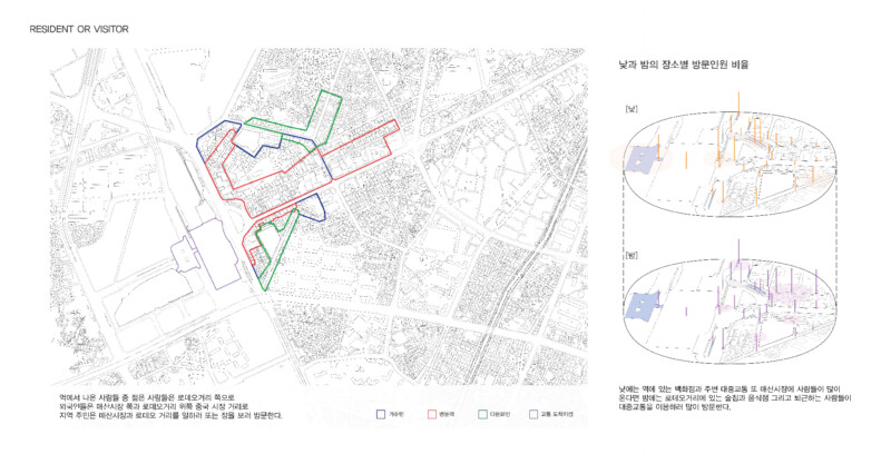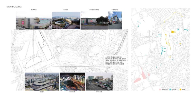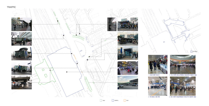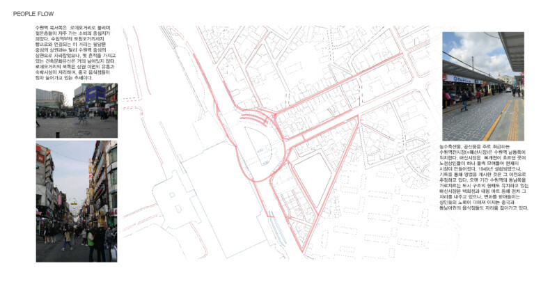 수원역은 교통의 요충지로 많은 사람들이 오가는 곳이다. 3구역으로 나눠진 상업구역은 각각의 매력을 품고 있으나 불편하고 복잡한 교통으로 인해 서로 원활히 연결되기 어렵다.
