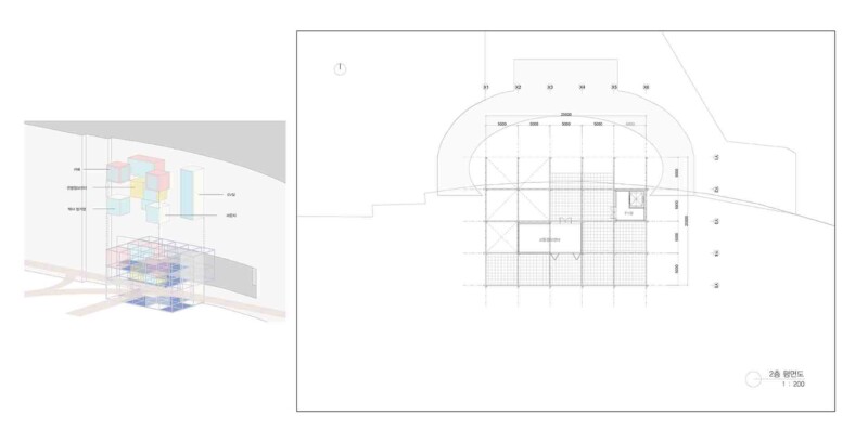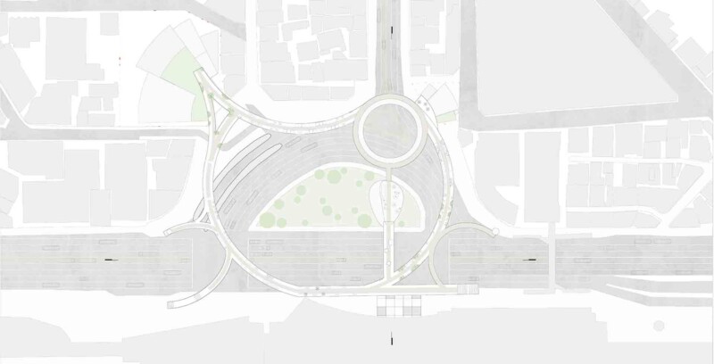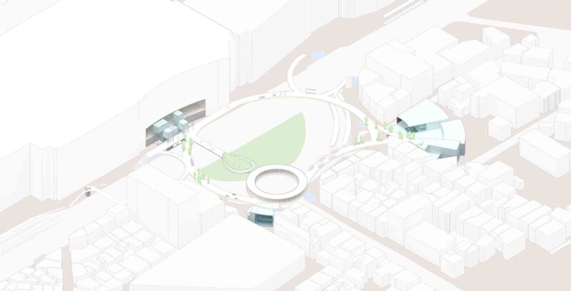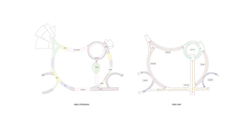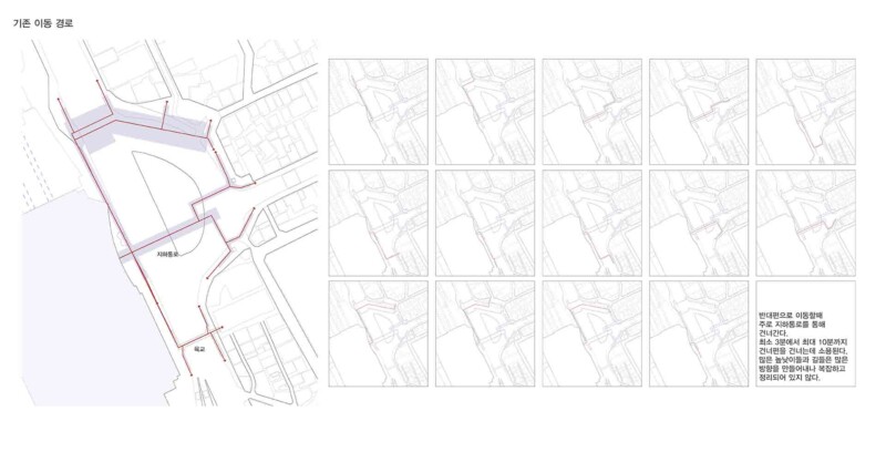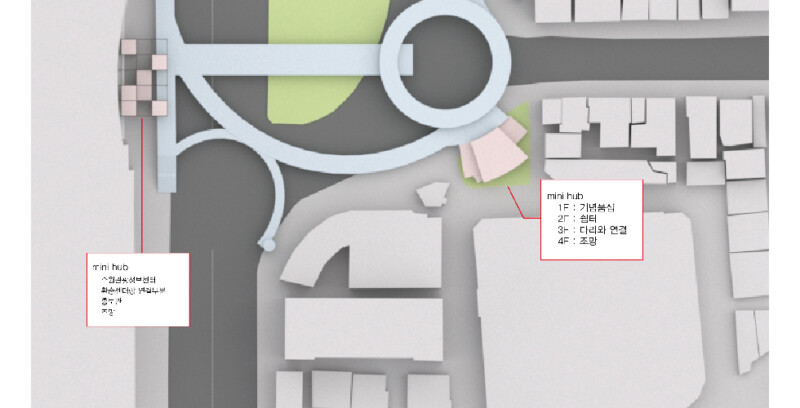미로같은 지하통로를 통과해야하는 것과, 뱡향이 주어지지 않는 연결은 사람들은 헷갈리게하고 헤메이게 만든다. 그렇기에 이곳에 거대한 보도교를 배치해 사람들에게 새로운 연결을 제안하고자 한다.