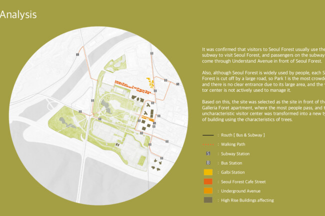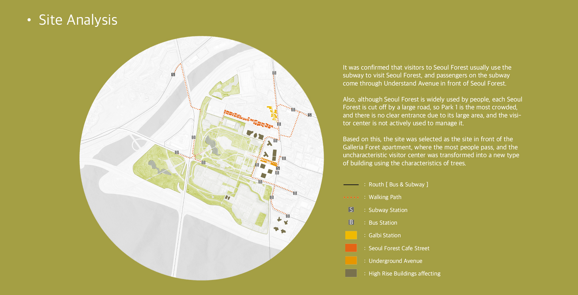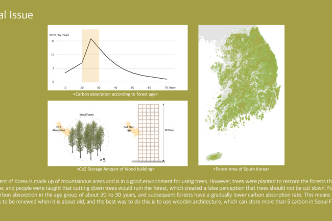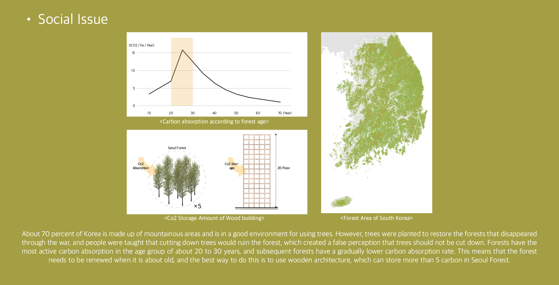 한국은 약 70%가 산지로 이루어져 있고, 나무를 사용하기에 좋은 환경에 있습니다. 하지만, 전후복구를 위해 나무를 심으며, 벌목은 숲을 해친다는 잘못된 인식을 심었습니다. 하지만, 숲은 약 20년에서 30년 정도의 연령대에서 가장 탄소 흡수가 활발하고, 이후의 숲은 탄소 흡수율이 점차 낮아집니다. 노령의 나무를 이용하는 가장 좋은 방법은 목조 건축을 이용하는 것으로 20개층의 목조건축물은 서울숲 5개 이상의 탄소를 저장합니다. 이러한 정보들의 홍보를 위한 건축물을 서울의 대표 도시숲인 서울숲에 계획하고자 하였습니다.