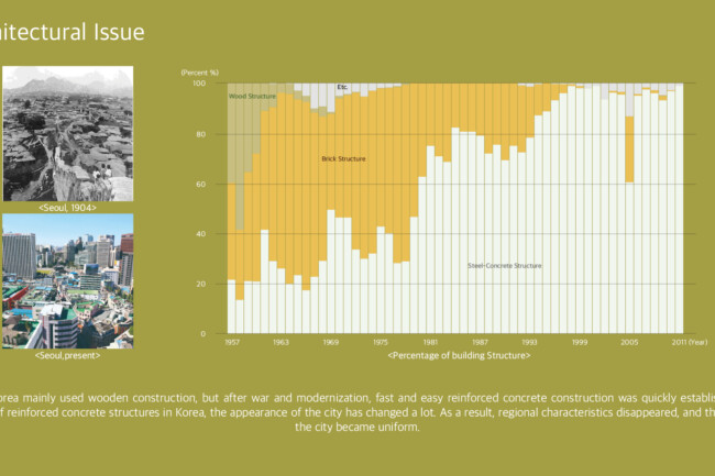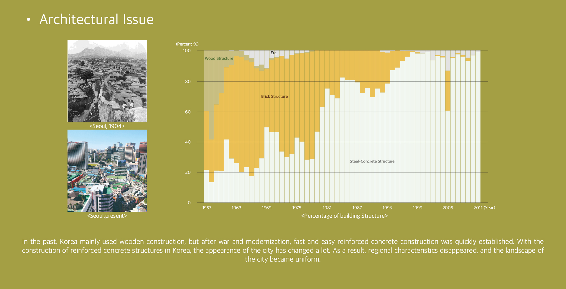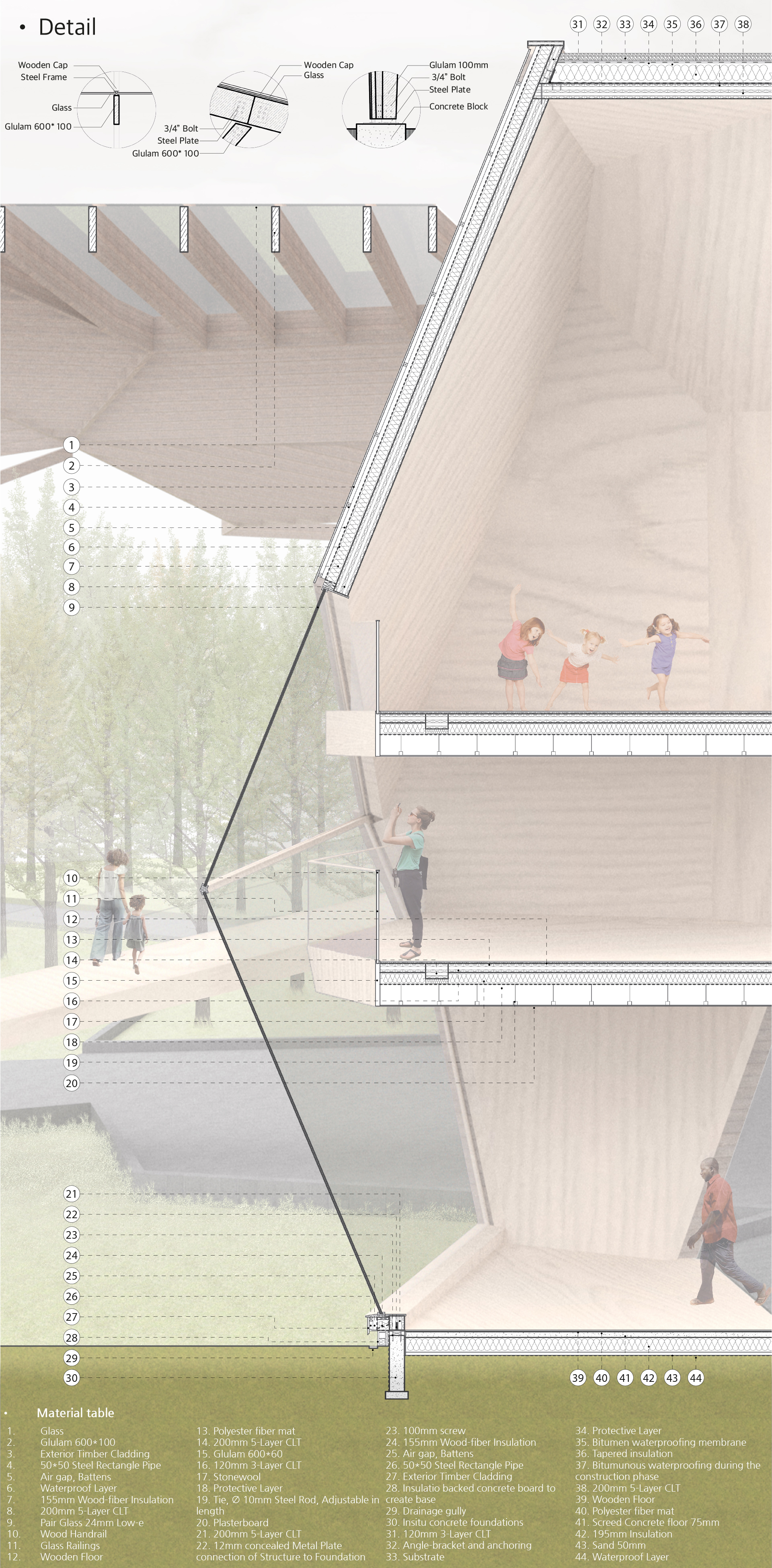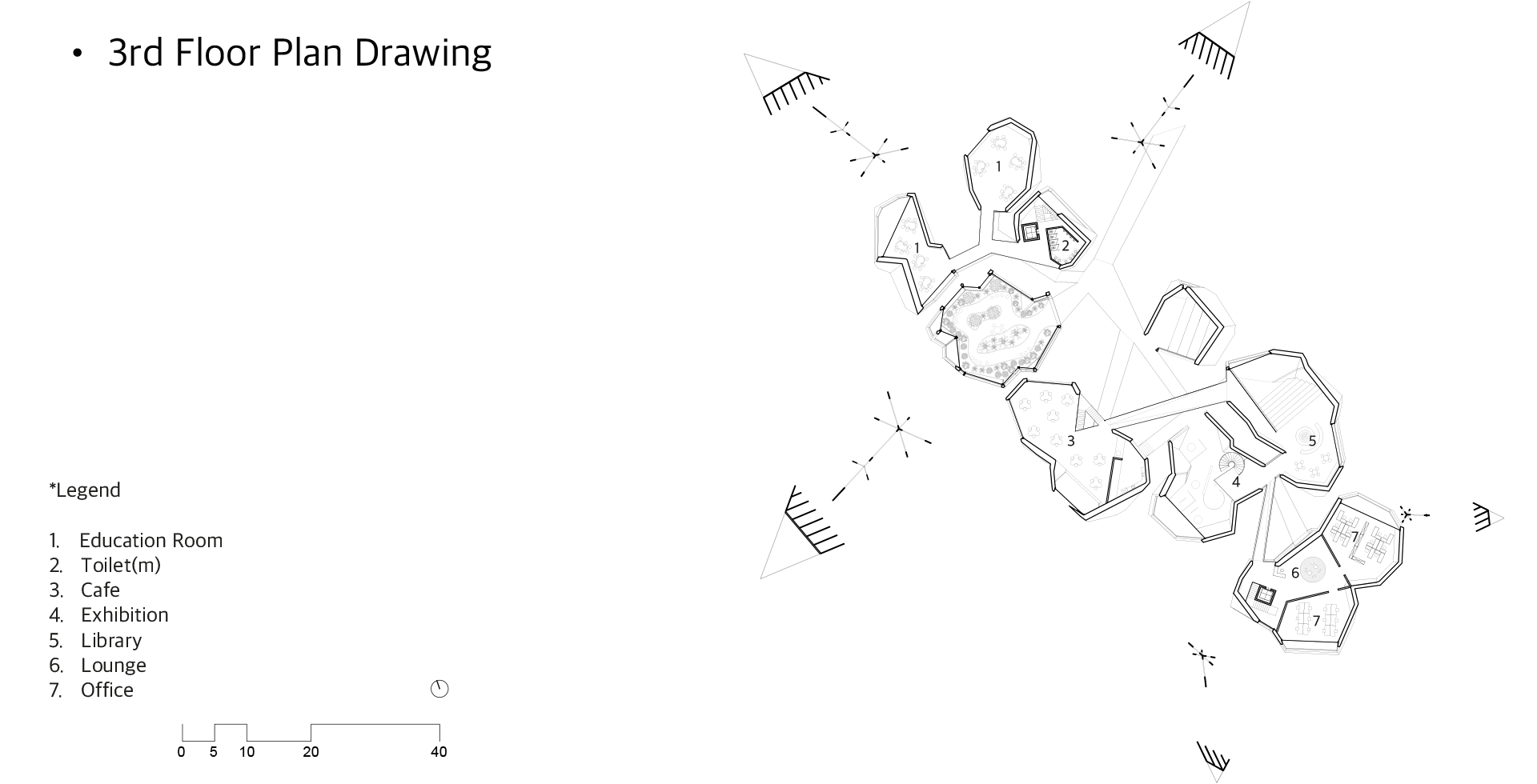 한국은 약 70%가 산지로 이루어져 있고, 나무를 사용하기에 좋은 환경에 있습니다. 하지만, 전후복구를 위해 나무를 심으며, 벌목은 숲을 해친다는 잘못된 인식을 심었습니다. 하지만, 숲은 약 20년에서 30년 정도의 연령대에서 가장 탄소 흡수가 활발하고, 이후의 숲은 탄소 흡수율이 점차 낮아집니다. 노령의 나무를 이용하는 가장 좋은 방법은 목조 건축을 이용하는 것으로 20개층의 목조건축물은 서울숲 5개 이상의 탄소를 저장합니다. 이러한 정보들의 홍보를 위한 건축물을 서울의 대표 도시숲인 서울숲에 계획하고자 하였습니다.