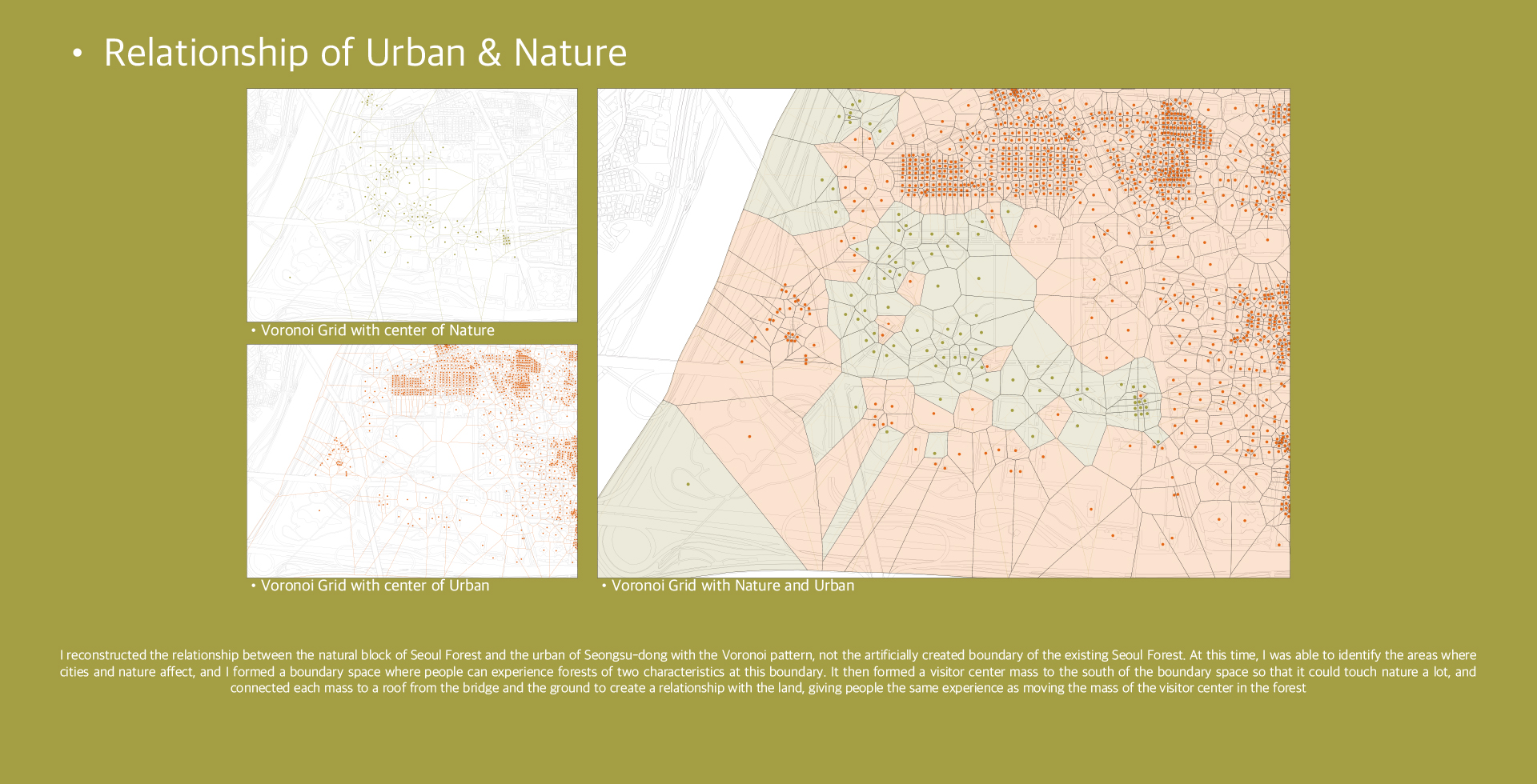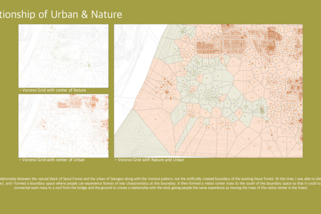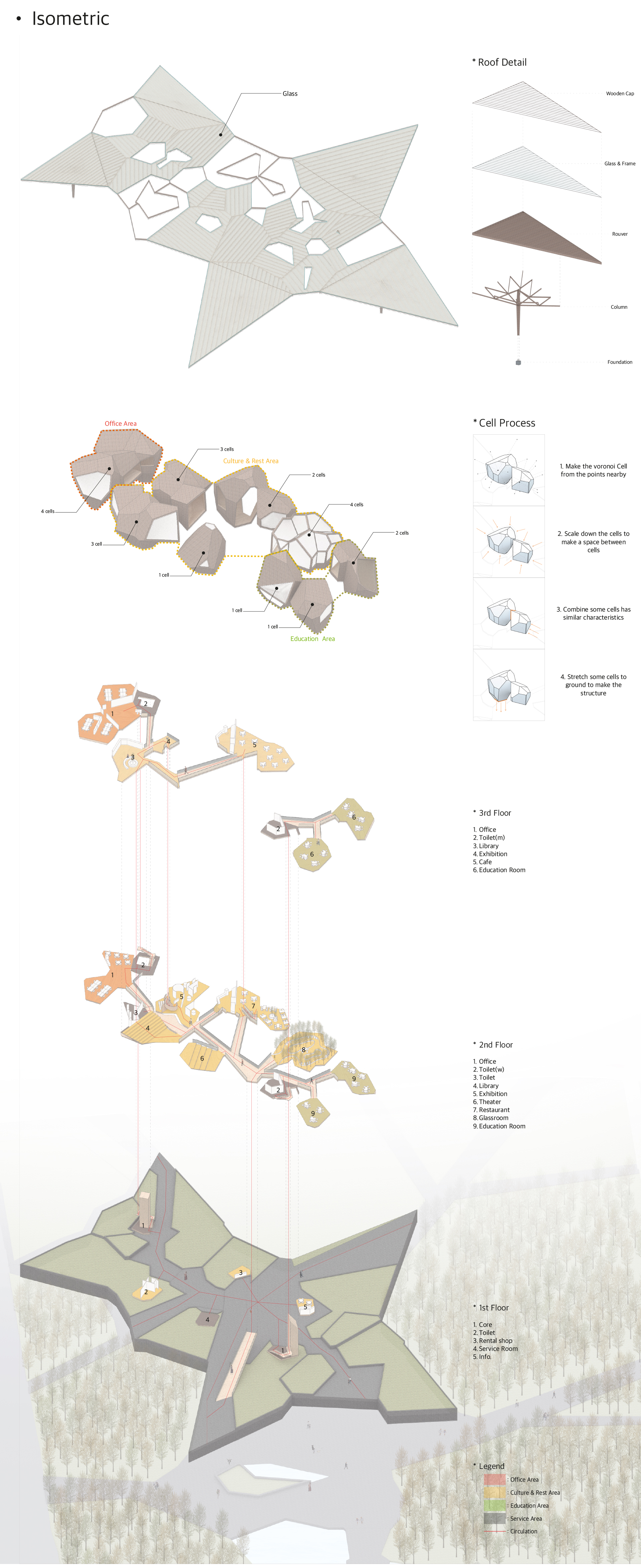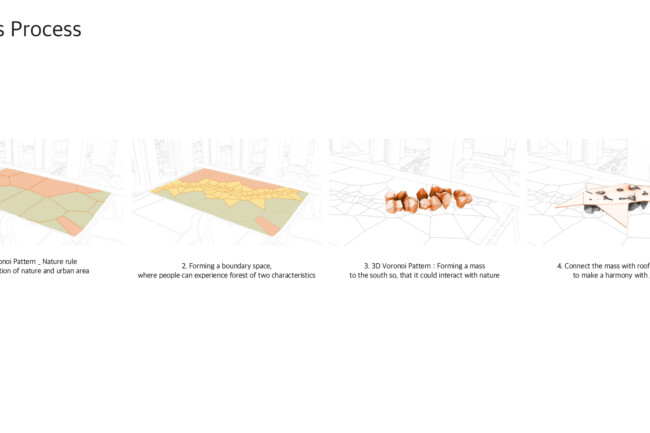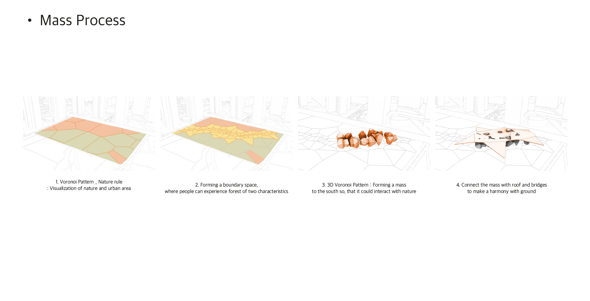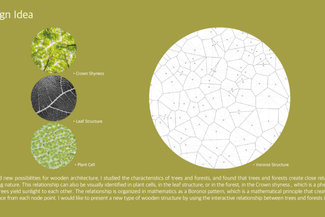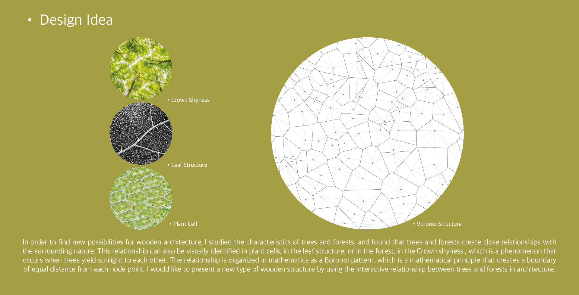 목조 건축의 새로운 가능성을 찾기 위해서 나무와 숲이 가지는 특징을 스터디하였고, 나무와 숲은 주변의 자연과 밀접한 관계를 만들어 낸다는 것을 알아내었습니다. 이는 식물세포에서나 나뭇잎의 잎맥에서 혹은 수관기피 현상에서도 이러한 관계를 시각적으로 확인할 수 있습니다. 이러한 관계는 보로노이 패턴으로 정리되어있고, 이는 각각의 노드점으로 부터 같은 거리의 경계를 만들어내는 수학적 원리입니다. 저는 나무와 숲이 가지는 상호작용적 관계를 건축적으로 이용하여 지금까지의 라멘구조와는 다른 구조의 목조 건축물을 제시하고자 합니다.