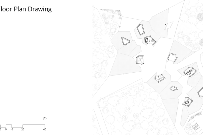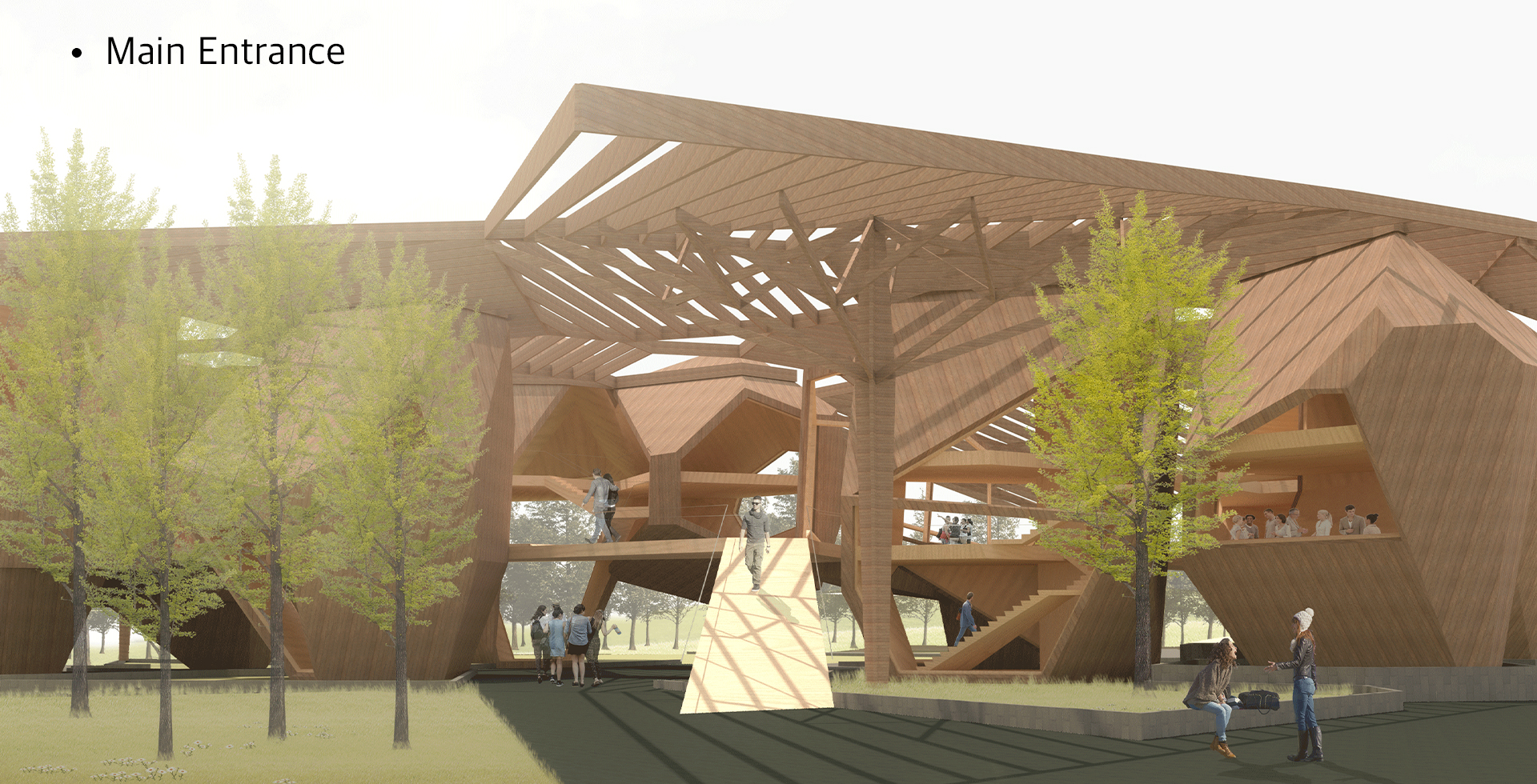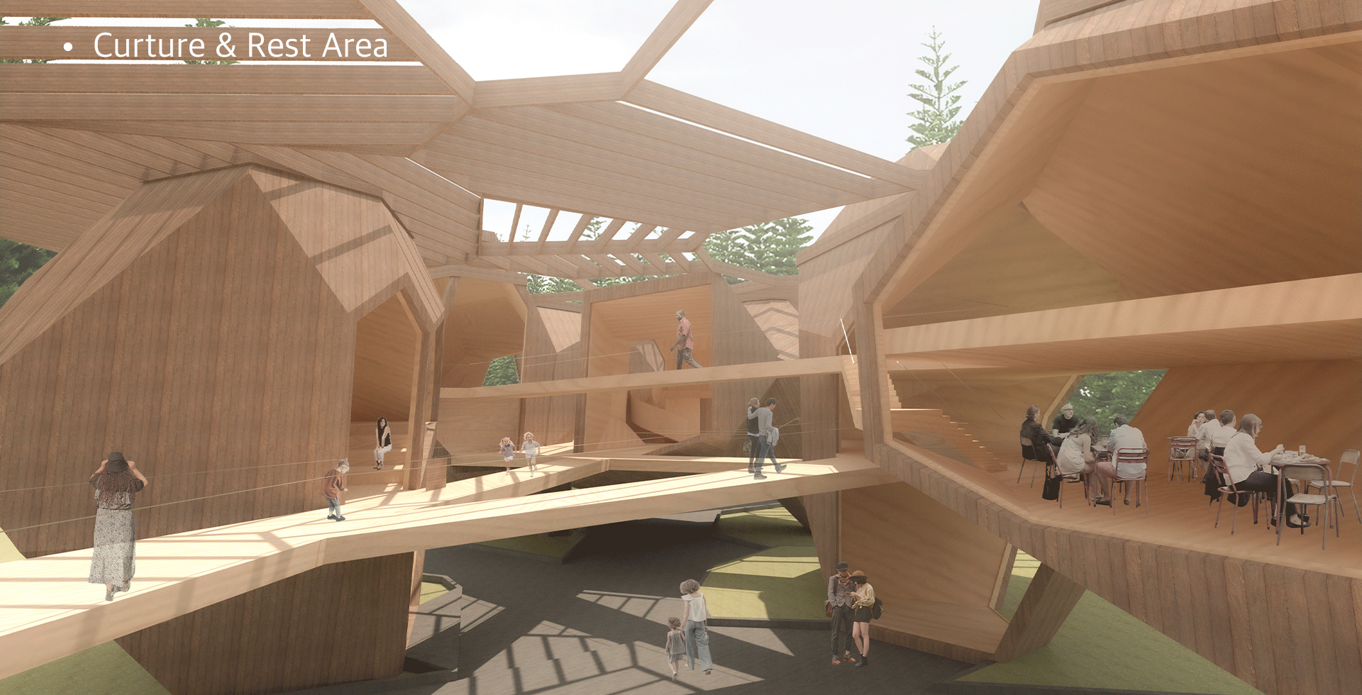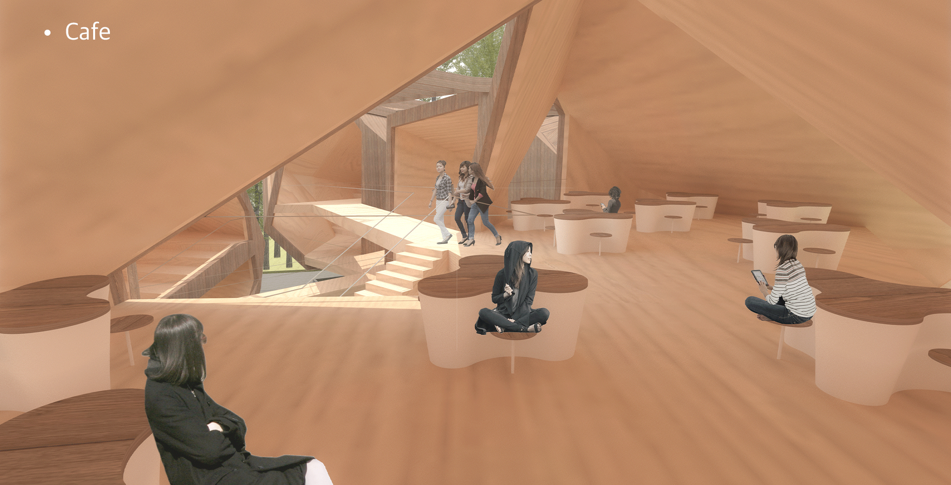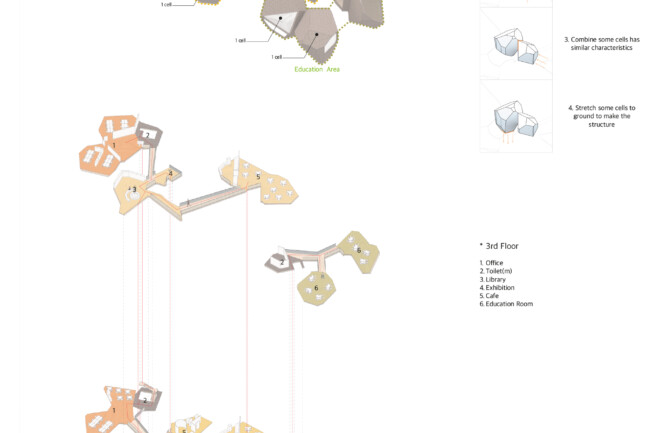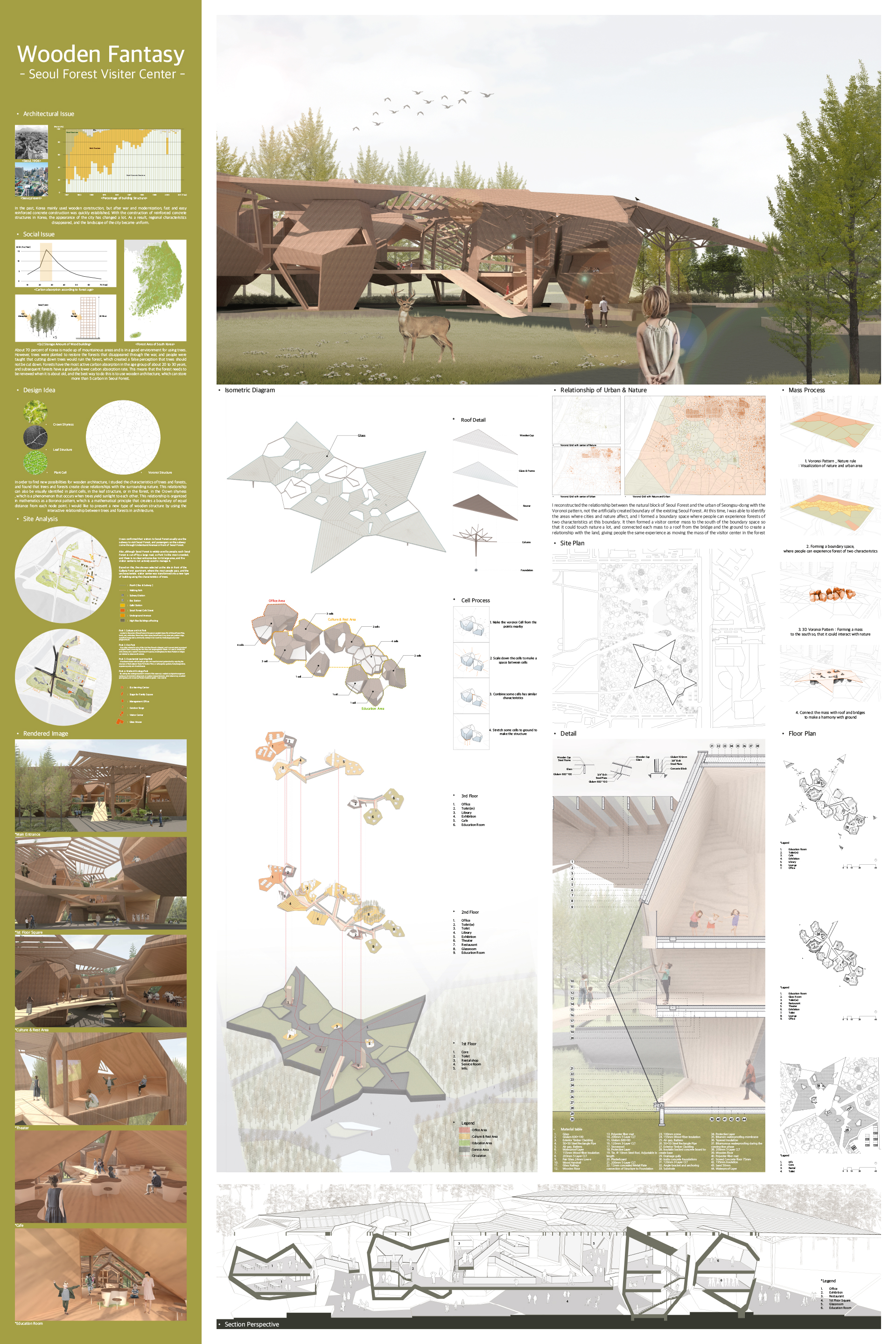 목조 건축의 새로운 가능성을 찾기 위해서 나무와 숲이 가지는 특징을 스터디하였고, 나무와 숲은 주변의 자연과 밀접한 관계를 만들어 낸다는 것을 알아내었습니다. 이는 식물세포에서나 나뭇잎의 잎맥에서 혹은 수관기피 현상에서도 이러한 관계를 시각적으로 확인할 수 있습니다. 이러한 관계는 보로노이 패턴으로 정리되어있고, 이는 각각의 노드점으로 부터 같은 거리의 경계를 만들어내는 수학적 원리입니다. 저는 나무와 숲이 가지는 상호작용적 관계를 건축적으로 이용하여 지금까지의 라멘구조와는 다른 구조의 목조 건축물을 제시하고자 합니다.