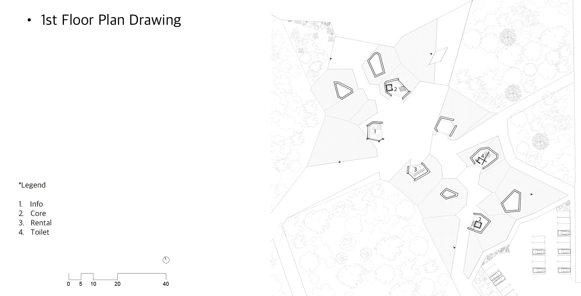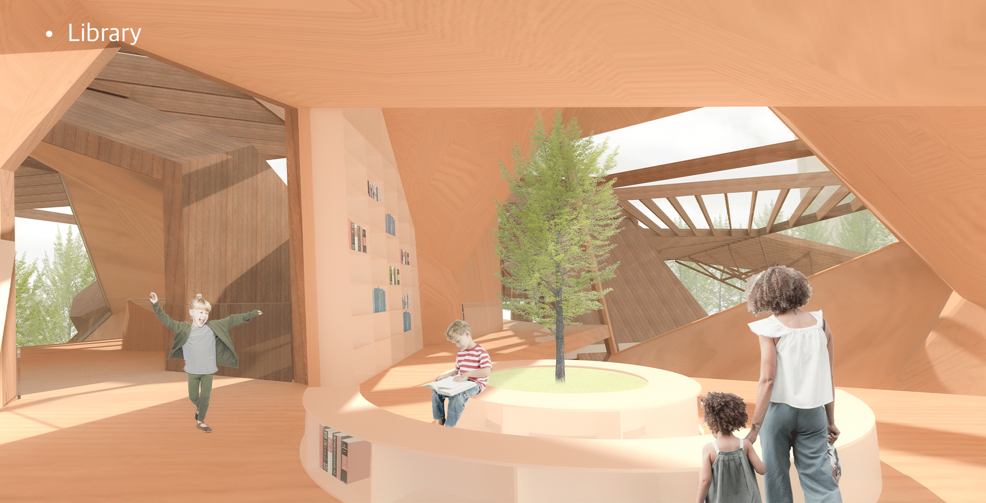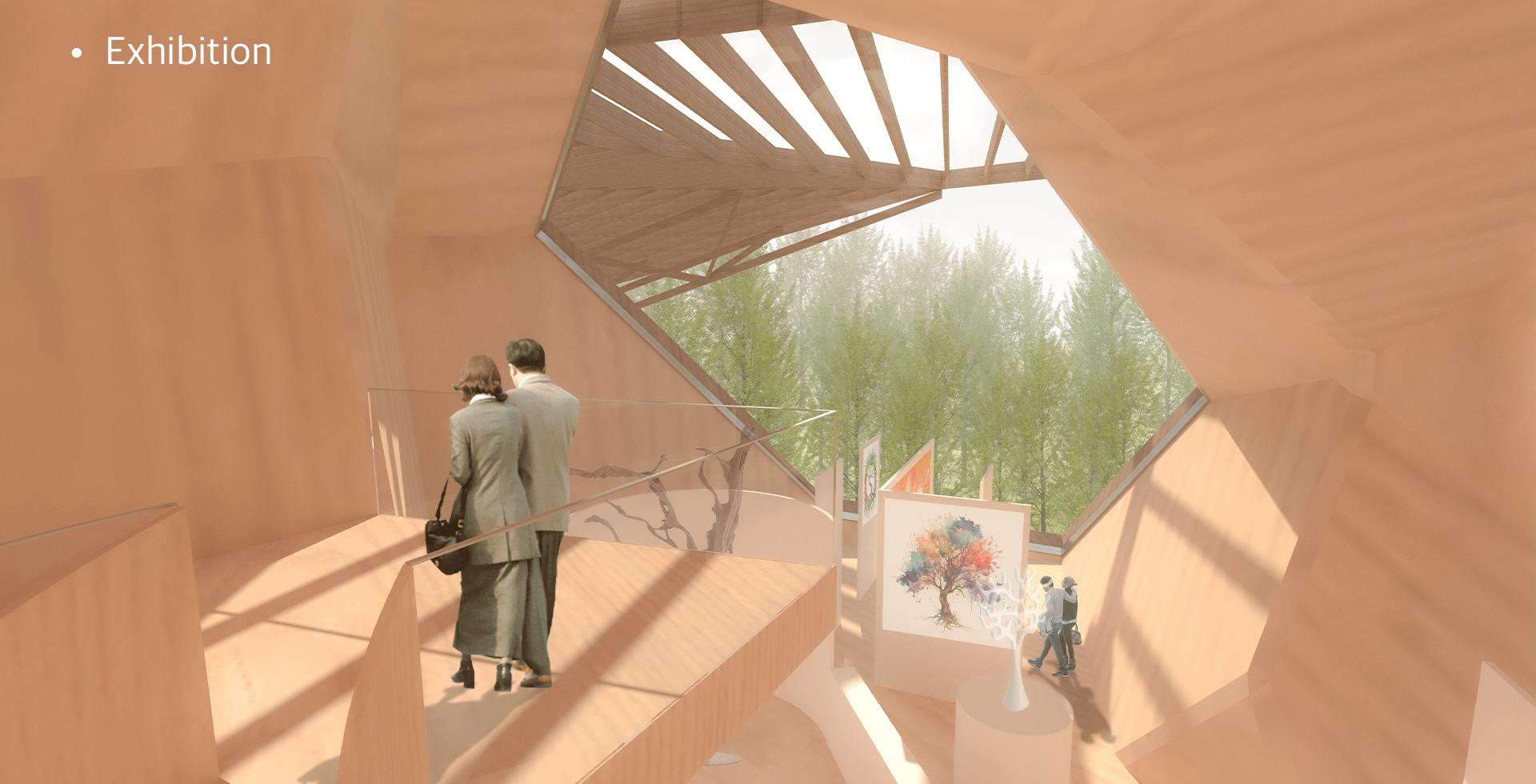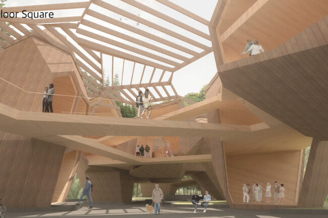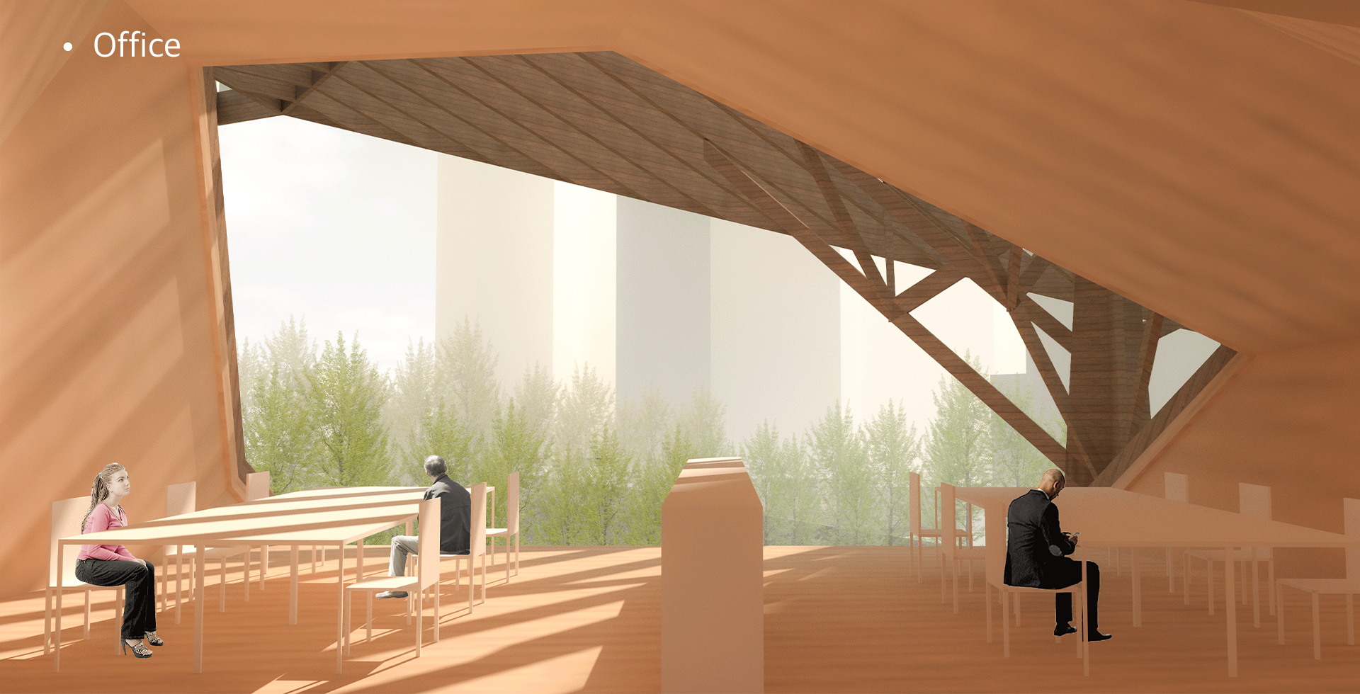 목조 건축의 새로운 가능성을 찾기 위해서 나무와 숲이 가지는 특징을 스터디하였고, 나무와 숲은 주변의 자연과 밀접한 관계를 만들어 낸다는 것을 알아내었습니다. 이는 식물세포에서나 나뭇잎의 잎맥에서 혹은 수관기피 현상에서도 이러한 관계를 시각적으로 확인할 수 있습니다. 이러한 관계는 보로노이 패턴으로 정리되어있고, 이는 각각의 노드점으로 부터 같은 거리의 경계를 만들어내는 수학적 원리입니다. 저는 나무와 숲이 가지는 상호작용적 관계를 건축적으로 이용하여 지금까지의 라멘구조와는 다른 구조의 목조 건축물을 제시하고자 합니다.
