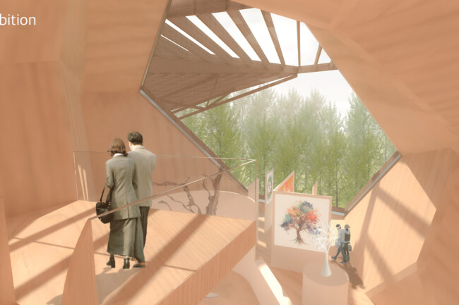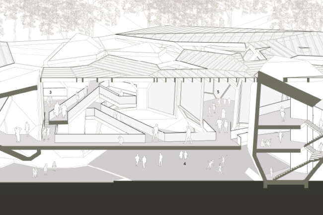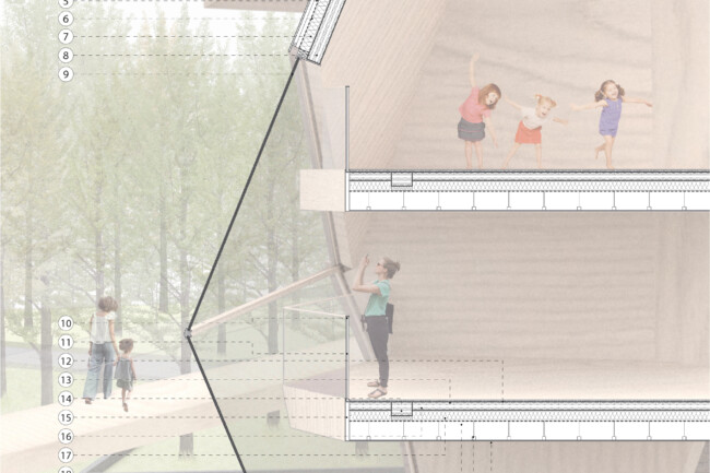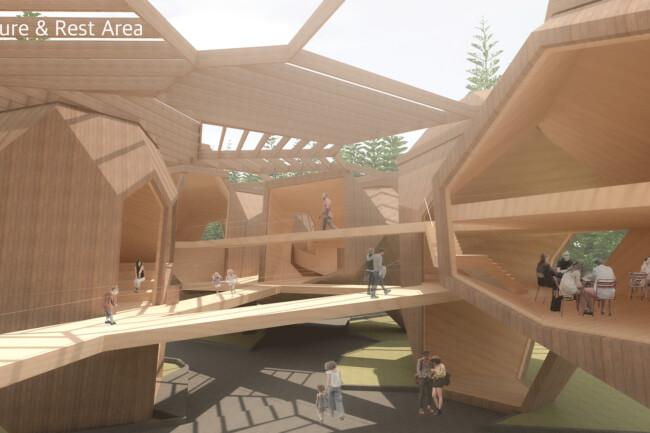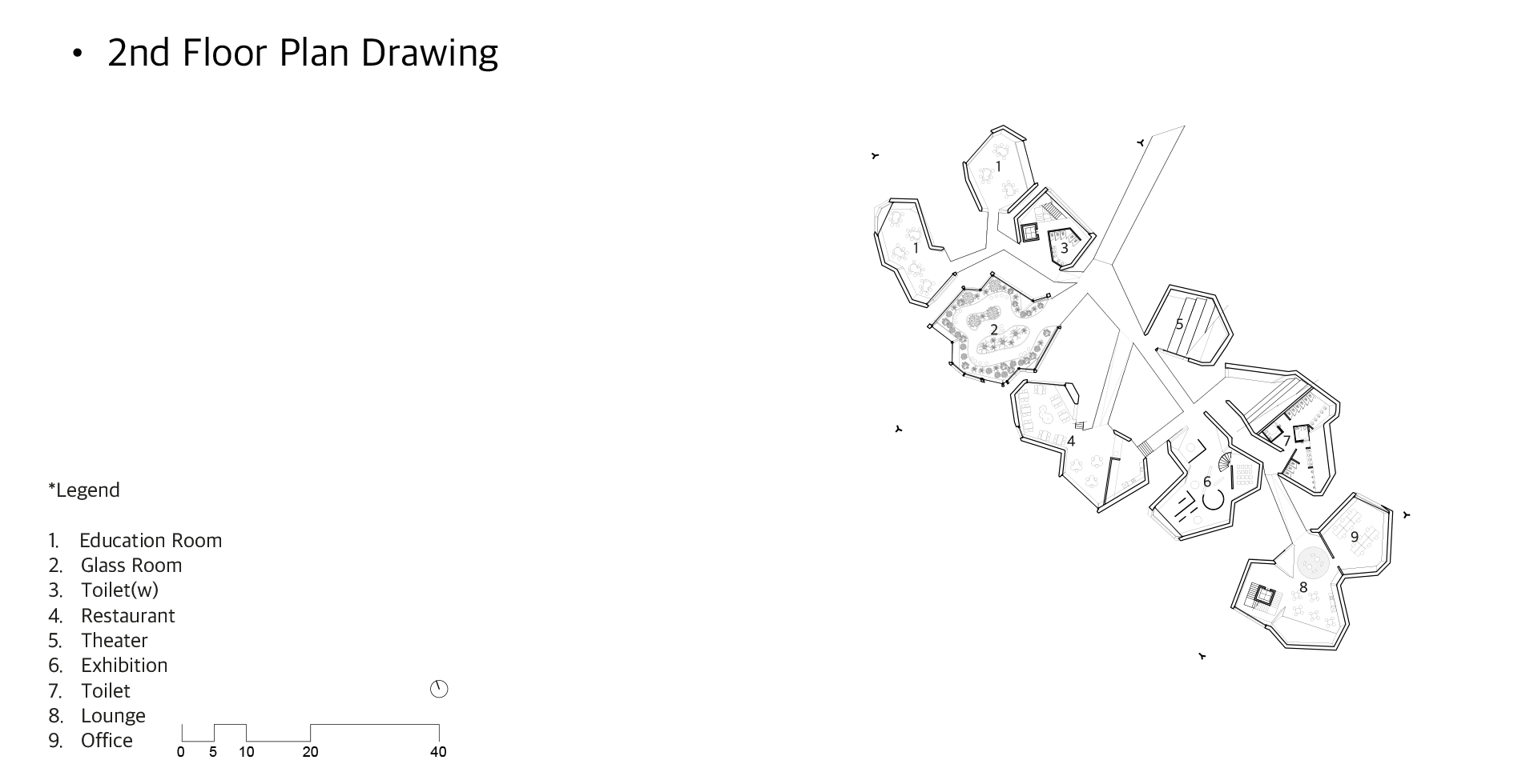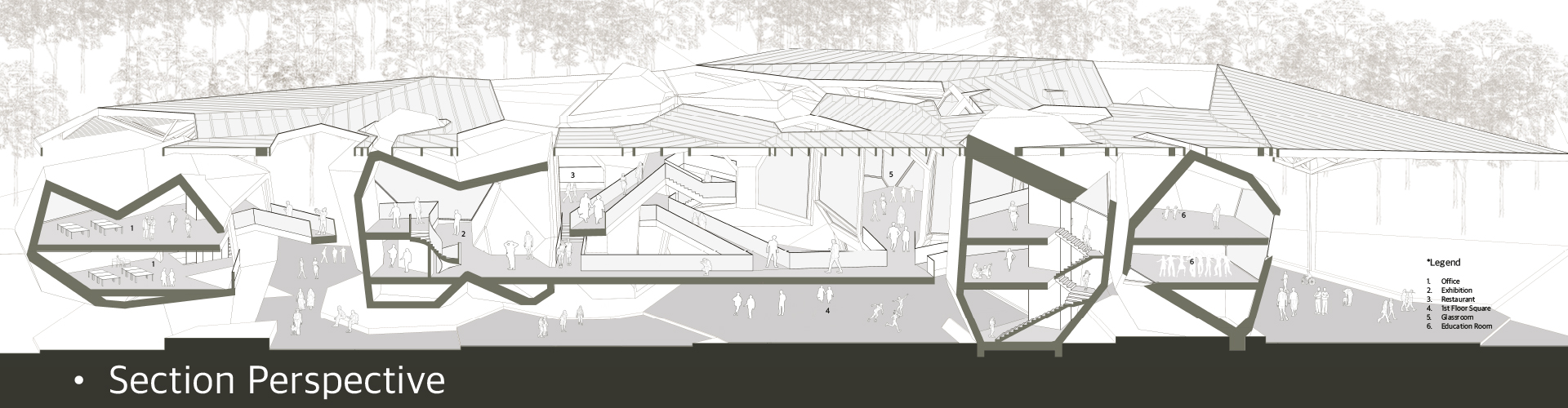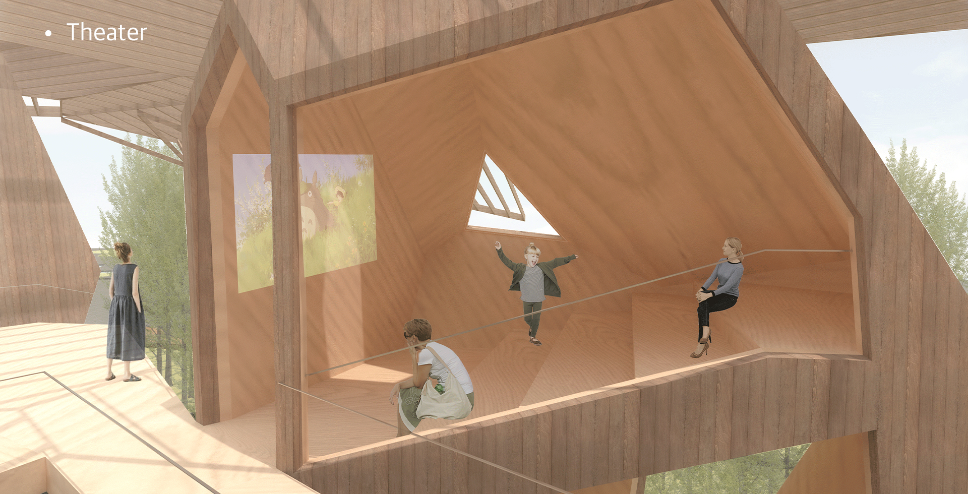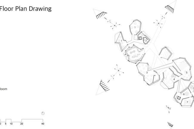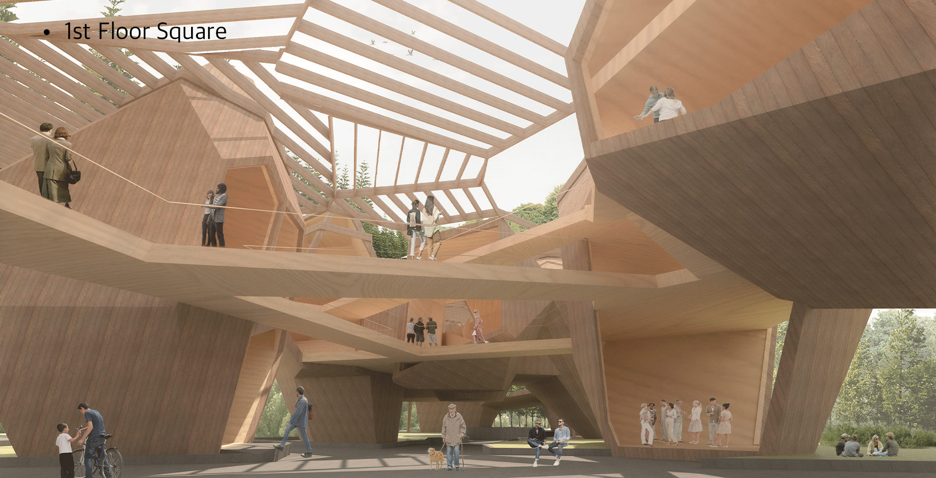 목조 건축의 새로운 가능성을 찾기 위해서 나무와 숲이 가지는 특징을 스터디하였고, 나무와 숲은 주변의 자연과 밀접한 관계를 만들어 낸다는 것을 알아내었습니다. 이는 식물세포에서나 나뭇잎의 잎맥에서 혹은 수관기피 현상에서도 이러한 관계를 시각적으로 확인할 수 있습니다. 이러한 관계는 보로노이 패턴으로 정리되어있고, 이는 각각의 노드점으로 부터 같은 거리의 경계를 만들어내는 수학적 원리입니다. 저는 나무와 숲이 가지는 상호작용적 관계를 건축적으로 이용하여 지금까지의 라멘구조와는 다른 구조의 목조 건축물을 제시하고자 합니다.