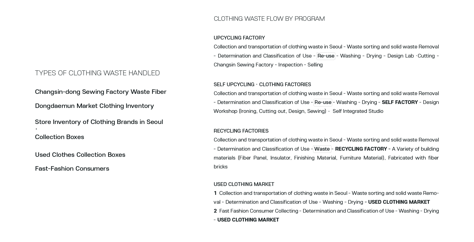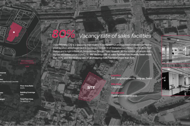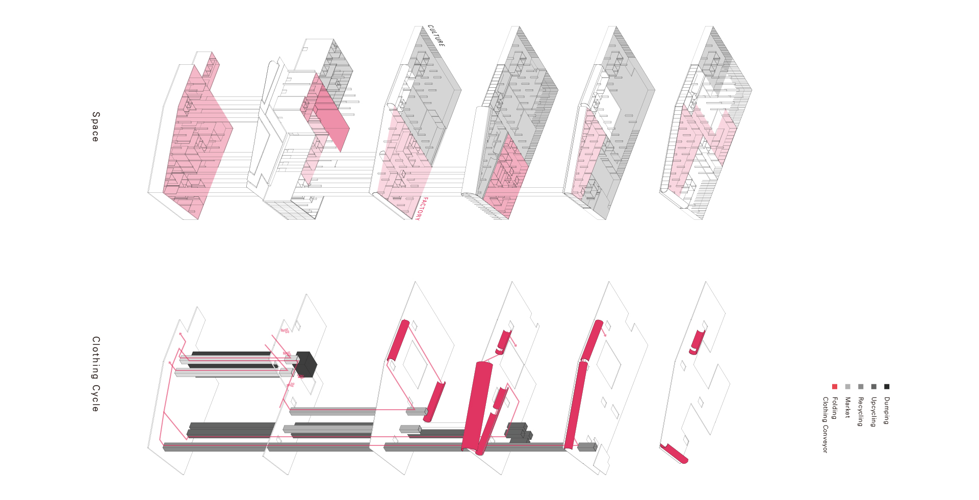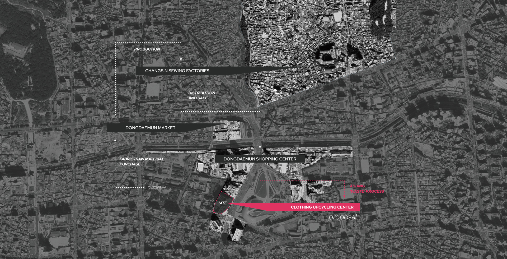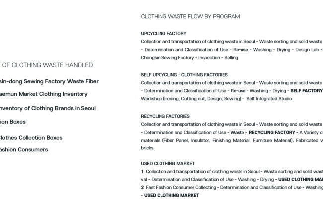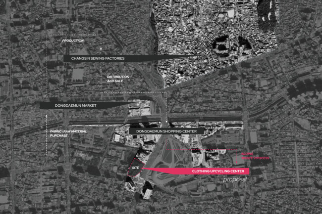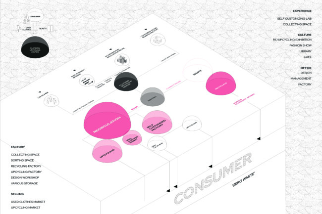 전 세계적으로 쉽게 만들고 쉽게 버리는 패스트 패션 문화가 퍼지면서 급증한 의류 폐기물들로 우리 지구는 심각한 환경 문제를 짊어지고 있다. 의류를 제작하는 모든 과정에서 심각한 환경 오염이 발생하며, 패스트 패션 문화는 이 상황을 더 악화시키기게 이르렀다. 한국의 패션 메카인 동대문 의류 클러스터는 의류 디자인, 생산, 판매가 모두 3일도 채 안되는 순환 구조를 가지고 있다. 이 프로젝트에선 새로운 친환경 ‘의류 폐기’ 과정을 추가하여 지속 가능한 미래 선순환을 제안하였다. 다양한 경로를 통해 들어온 서울의 의류 폐기물과 폐섬유들은 저마다 분류 기준에 따라 검수와 분류 과정을 거치고 재순환된다. 재순환 과정과 의류 운반 코어를 노출시켜 우리 모두가 건축물 내외부에서 사이클을 시각적으로 경험하고, 직접 프로세스에 참여하기도 한다. Zerowaste를 추구하는 우리는 새로운 자원과 지속가능한 미래, 지역 커뮤니티의 잠재성을 부활시킬 수 있을 것이다.
