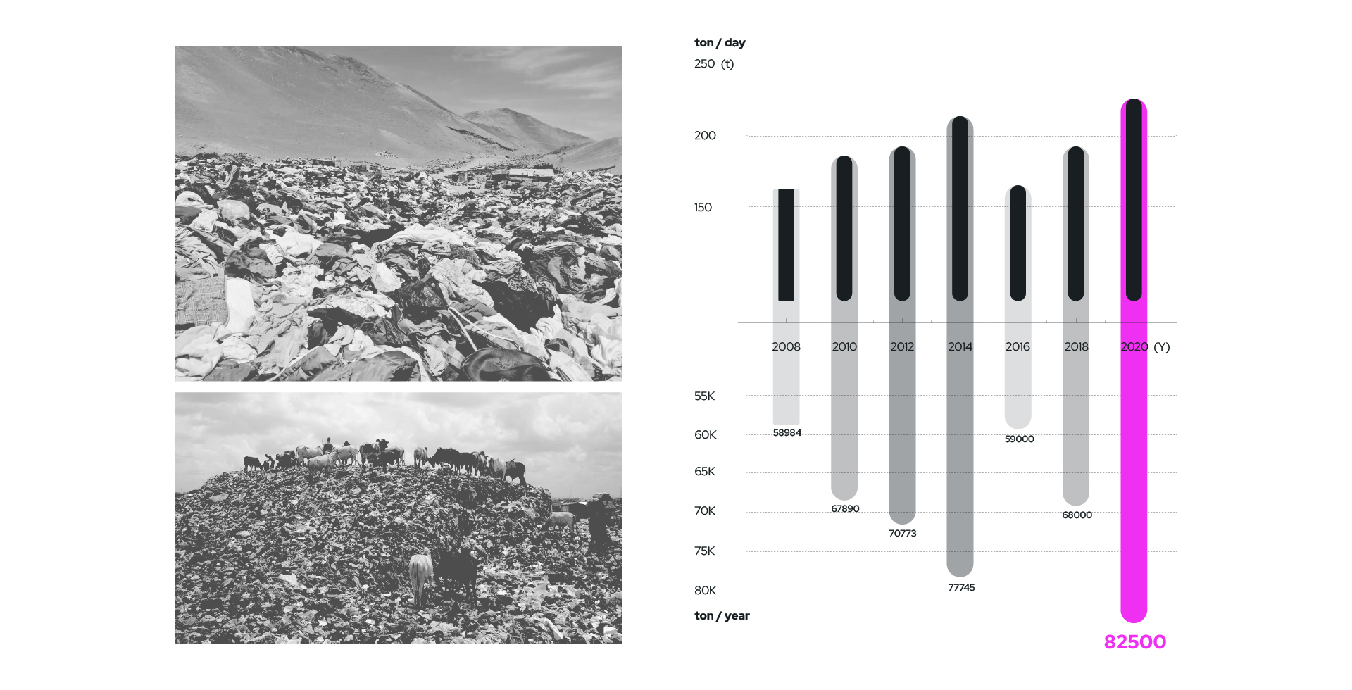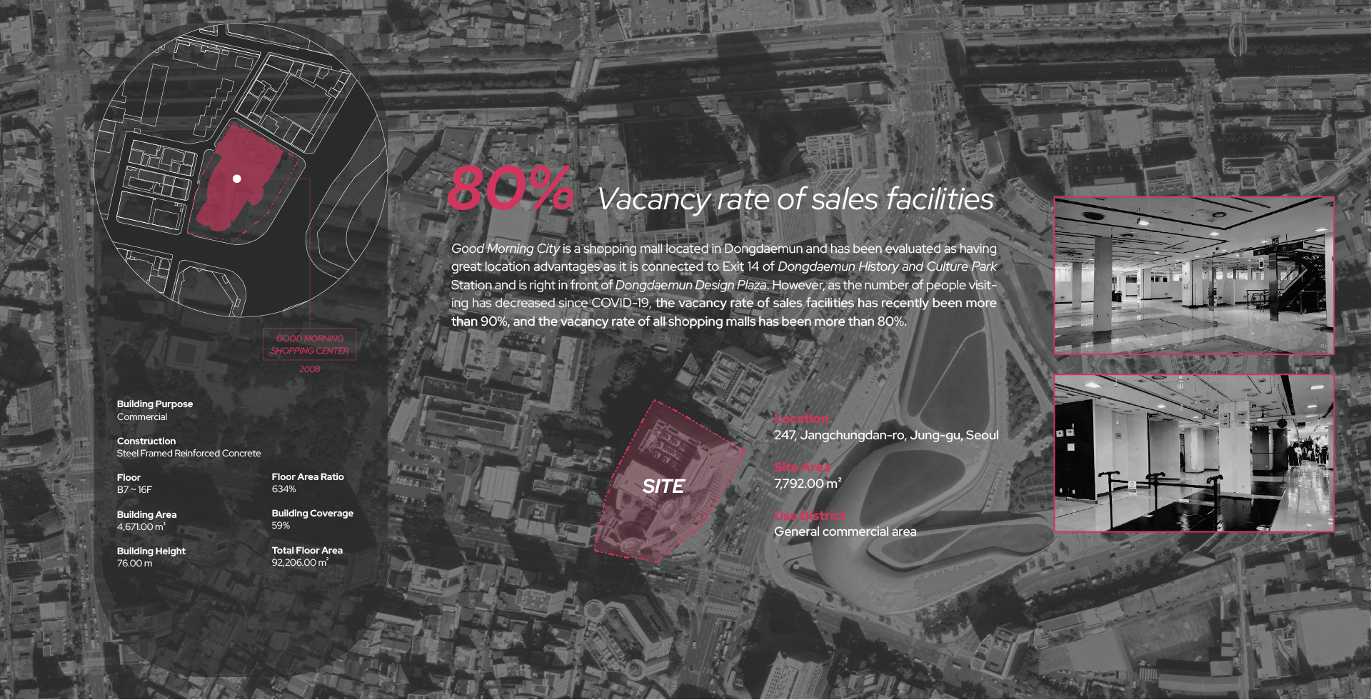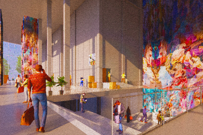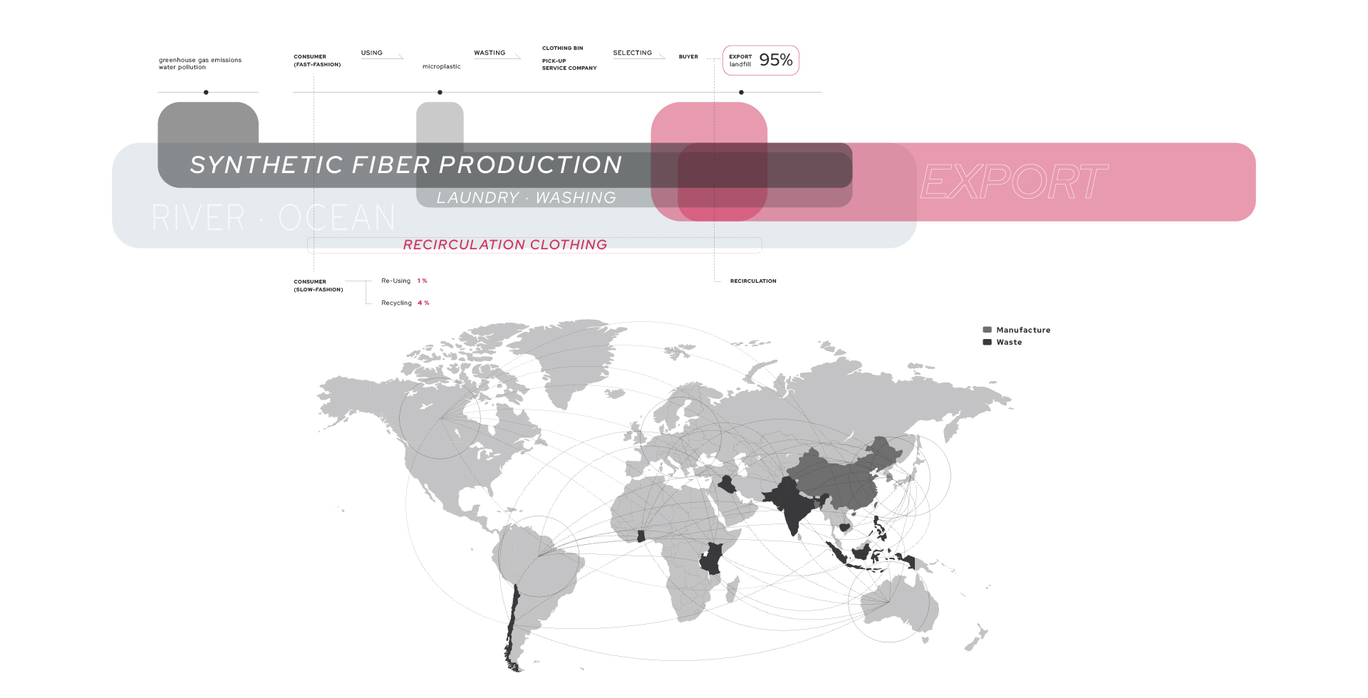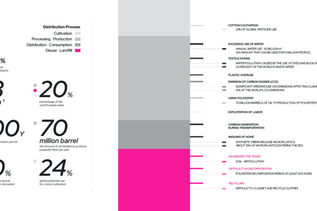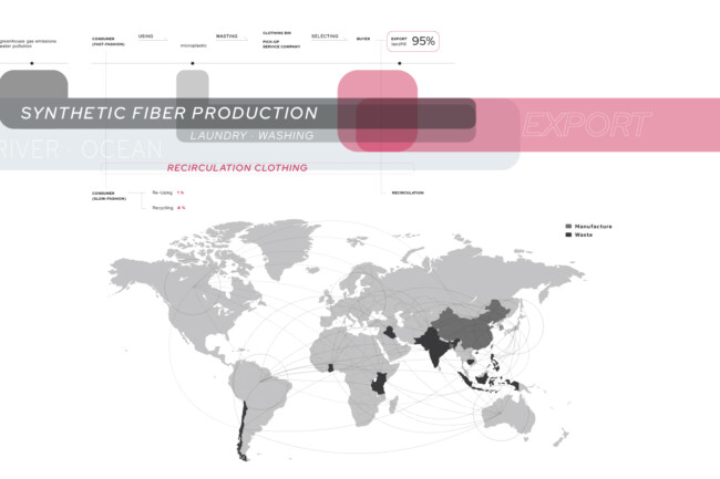 전 세계적으로 쉽게 만들고 쉽게 버리는 패스트 패션 문화가 퍼지면서 급증한 의류 폐기물들로 우리 지구는 심각한 환경 문제를 짊어지고 있다. 의류를 제작하는 모든 과정에서 심각한 환경 오염이 발생하며, 패스트 패션 문화는 이 상황을 더 악화시키기게 이르렀다. 한국의 패션 메카인 동대문 의류 클러스터는 의류 디자인, 생산, 판매가 모두 3일도 채 안되는 순환 구조를 가지고 있다. 이 프로젝트에선 새로운 친환경 ‘의류 폐기’ 과정을 추가하여 지속 가능한 미래 선순환을 제안하였다. 다양한 경로를 통해 들어온 서울의 의류 폐기물과 폐섬유들은 저마다 분류 기준에 따라 검수와 분류 과정을 거치고 재순환된다. 재순환 과정과 의류 운반 코어를 노출시켜 우리 모두가 건축물 내외부에서 사이클을 시각적으로 경험하고, 직접 프로세스에 참여하기도 한다. Zerowaste를 추구하는 우리는 새로운 자원과 지속가능한 미래, 지역 커뮤니티의 잠재성을 부활시킬 수 있을 것이다.