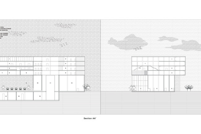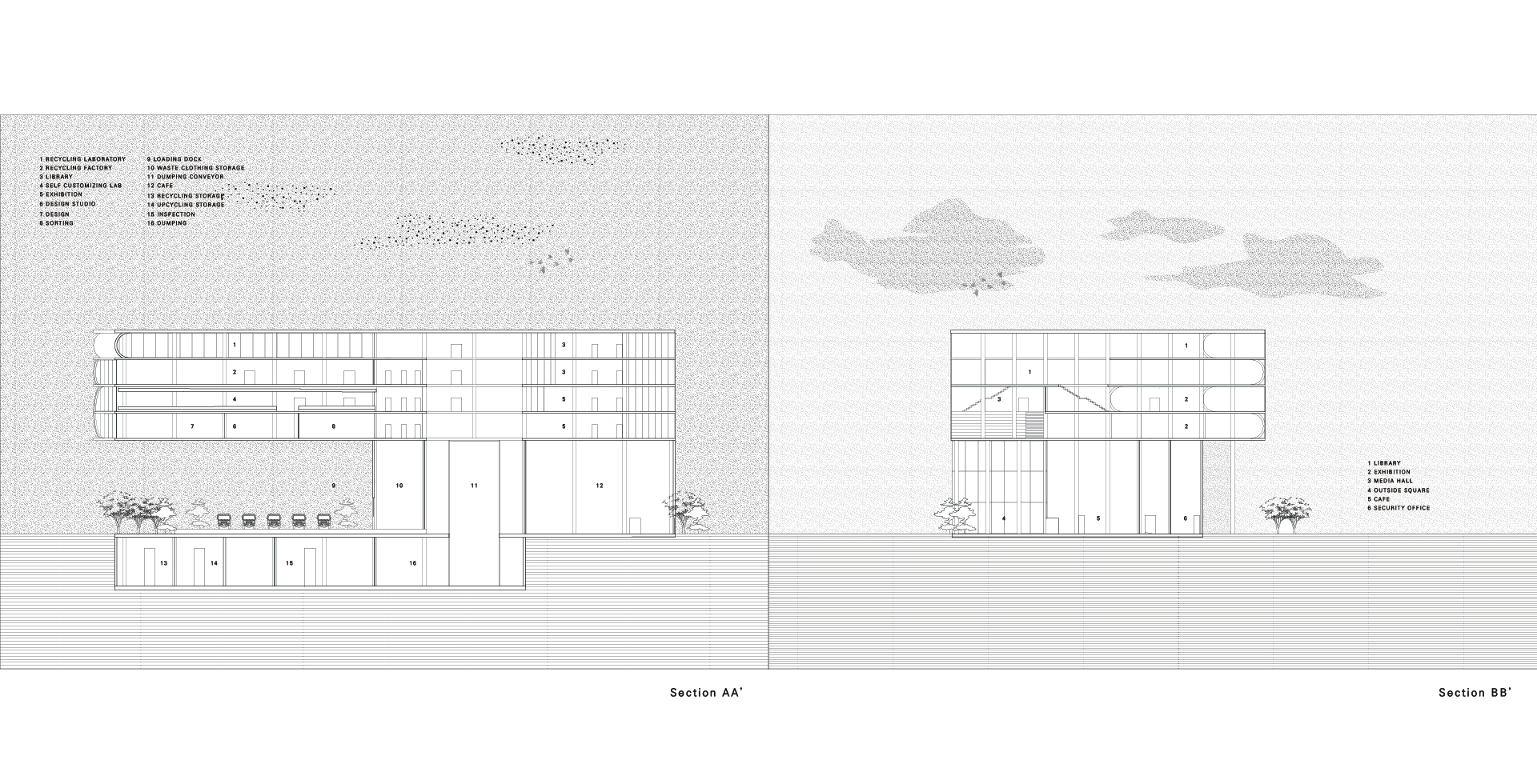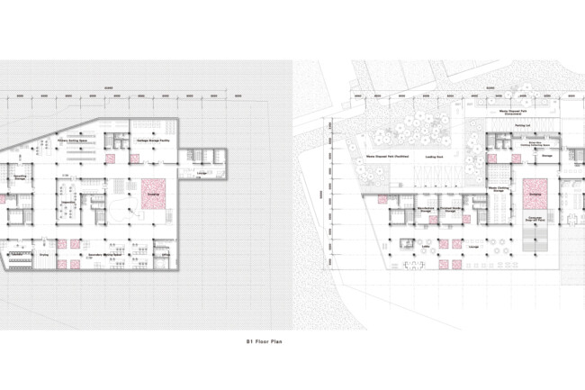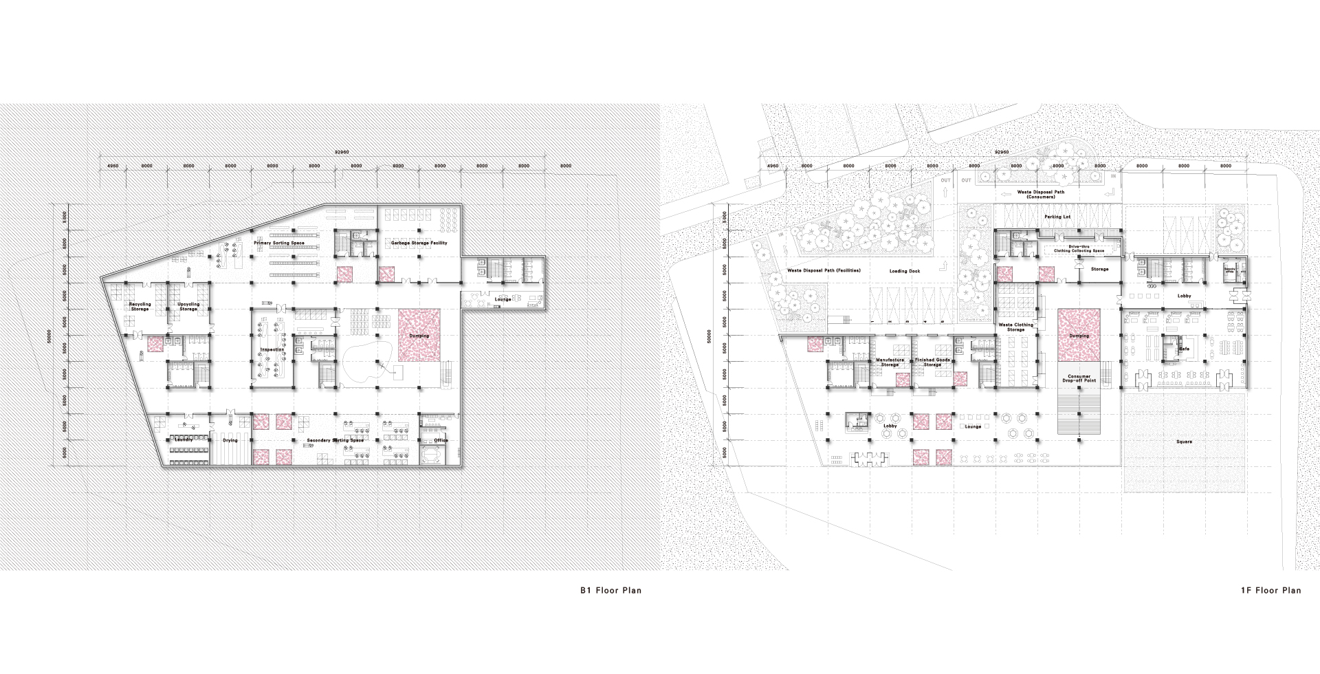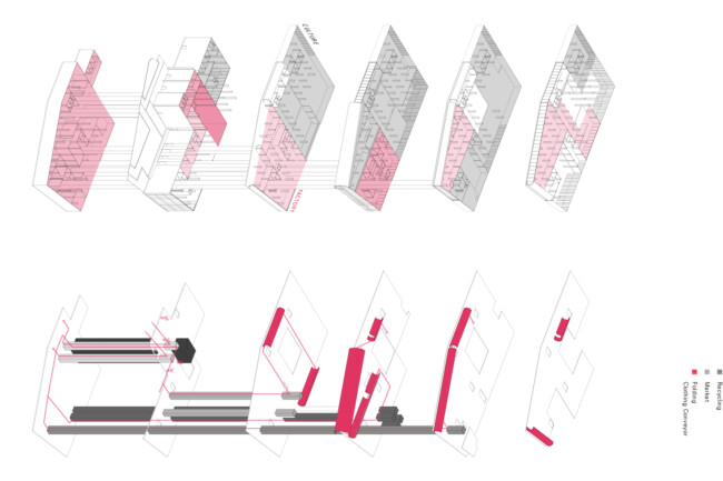 1층 하역장에서 지하1층으로 내려간 폐기물들은 Dumping Space를 지나 검수실에서 오물 제거 작업을 하고, 1차 분류실에서 오염 상태로 리사이클, 업사이클을 정한다. 그 후 창고로 이동되어 2차 분류실에서 업사이클링 될 폐기물들의 색상, 용도, 재질 등을 구별하여 의류 코어로 올린다. 이 과정이 순차적으로 일어날 수 있는 동선을 구성하였고, 1층의 로비 공간에서 소비자 드랍오프 공간이 연계될 수 있도록 평면을 구성하였다. 또한, 카페와 광장을 기존 공간에서 구분하여 외부 환경과 연결될 수 있는 공간을 생각하였다.